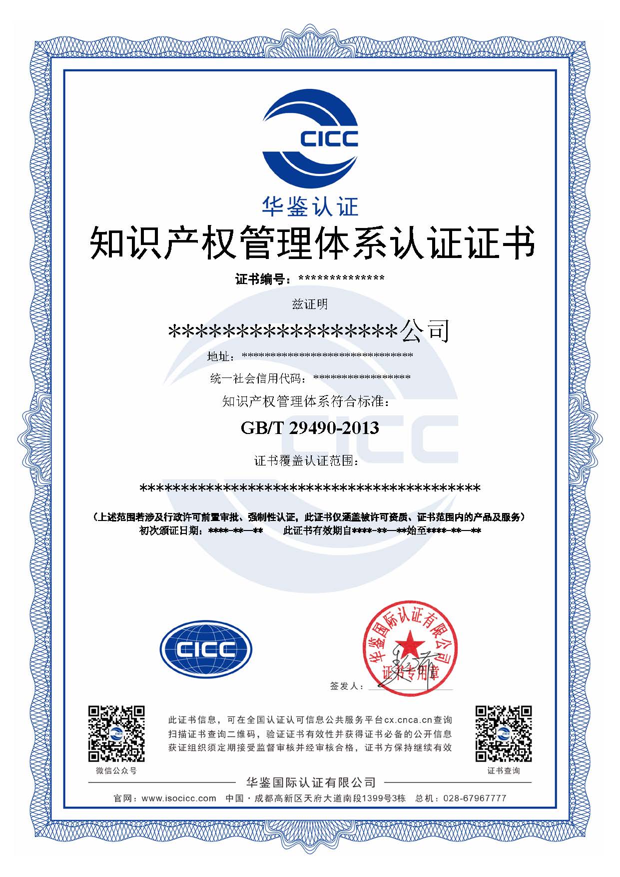 知识产权管理体系认证证书